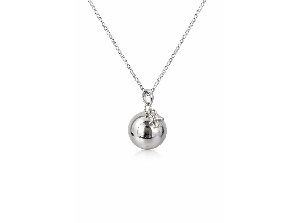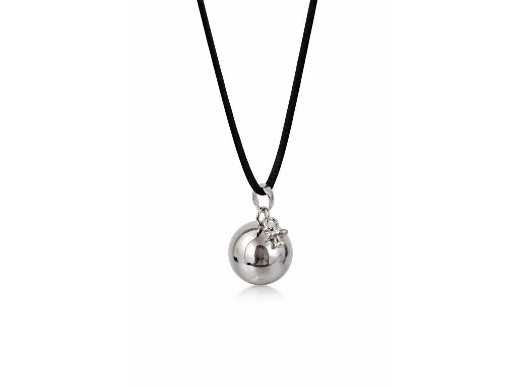 Bola ve stříbrné barvě s přívěskem maličkého dudlíčku, má průměr 18mm. Je vyrobena z mědi a mosazi. Bola je dodávána na dlouhé černé saténové šňůrce (cca 130cm) zavázané jen na uzlík, aby se dala délka v průběhu těhotenství snadno přizpůsobovat rostoucímu těhotenskému bříšku. Nebo lze objednat rolničku na řetízku z bižuterního kovu, který má délku cca 130cm, z toho 8cm lze libovolně nastavovat. Pro větší variabilitu délky však doporučuji zvolit variantu na šňůrce.