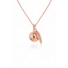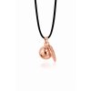 Bola v odstínu rosegold s přívěskem pírka, má průměr 18mm. Je vyrobena z mědi a mosazi. Bola je dodávána na dlouhé černé saténové šňůrce (cca 130cm) zavázané jen na uzlík, aby se dala délka v průběhu těhotenství snadno přizpůsobovat rostoucímu těhotenskému bříšku. Nebo lze objednat rolničku na řetízku z bižuterního kovu, který má délku cca 130cm, z toho 8cm lze libovolně nastavovat. Pro větší variabilitu délky však doporučuji zvolit variantu na šňůrce.