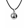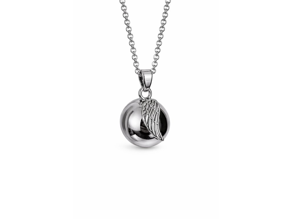 Bola ve stříbrné barvě s přívěskem ochranného andělského křídla , má průměr 18mm. Je vyrobena z mědi a mosazi. Bola je dodávána na dlouhé černé saténové šňůrce (cca 130cm) zavázané jen na uzlík, aby se dala délka v průběhu těhotenství snadno přizpůsobovat rostoucímu těhotenskému bříšku. Nebo lze objednat rolničku na řetízku z bižuterního kovu, který má délku cca 130cm, z toho 8cm lze libovolně nastavovat. Pro větší variabilitu délky však doporučuji zvolit variantu na šňůrce.