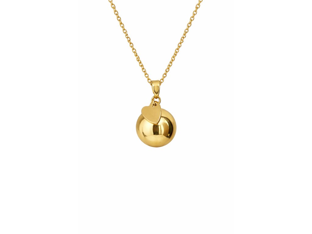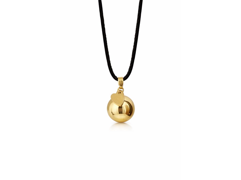 Bola ve zlaté barvě s přívěskem srdíčka, má průměr 18mm. Je vyrobena z mědi a mosazi. Bola je dodávána na dlouhé černé saténové šňůrce (cca 130cm) zavázané jen na uzlík, aby se dala délka v průběhu těhotenství snadno přizpůsobovat rostoucímu těhotenskému bříšku. Nebo lze objednat rolničku na řetízku z bižuterního kovu, který má délku cca 130cm, z toho 8cm lze libovolně nastavovat. Pro větší variabilitu délky však doporučuji zvolit variantu na šňůrce.