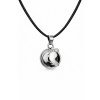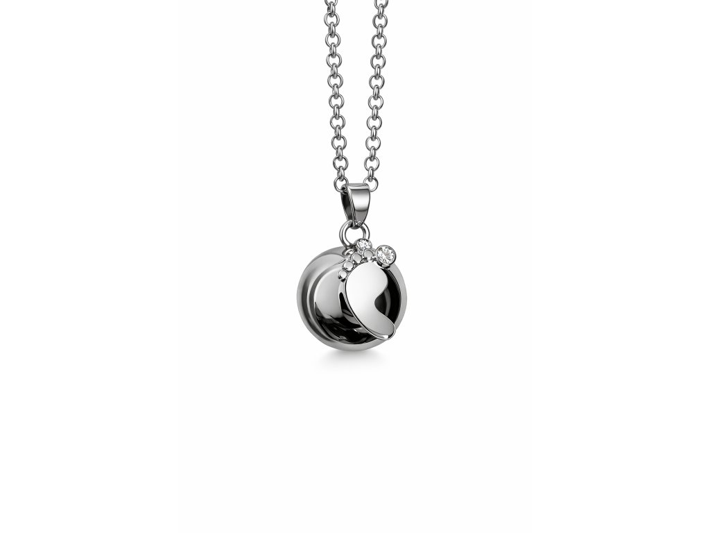 Bola ve stříbrné barvě s přívěskem nožičky-ťapičky, má průměr 18mm. Je vyrobena z mědi a mosazi. Bola je dodávána na dlouhé černé saténové šňůrce (cca 130cm) zavázané jen na uzlík, aby se dala délka v průběhu těhotenství snadno přizpůsobovat rostoucímu těhotenskému bříšku. Nebo lze objednat rolničku na řetízku z bižuterního kovu, který má délku cca 130cm, z toho 8cm lze libovolně nastavovat. Pro větší variabilitu délky však doporučuji zvolit variantu na šňůrce.